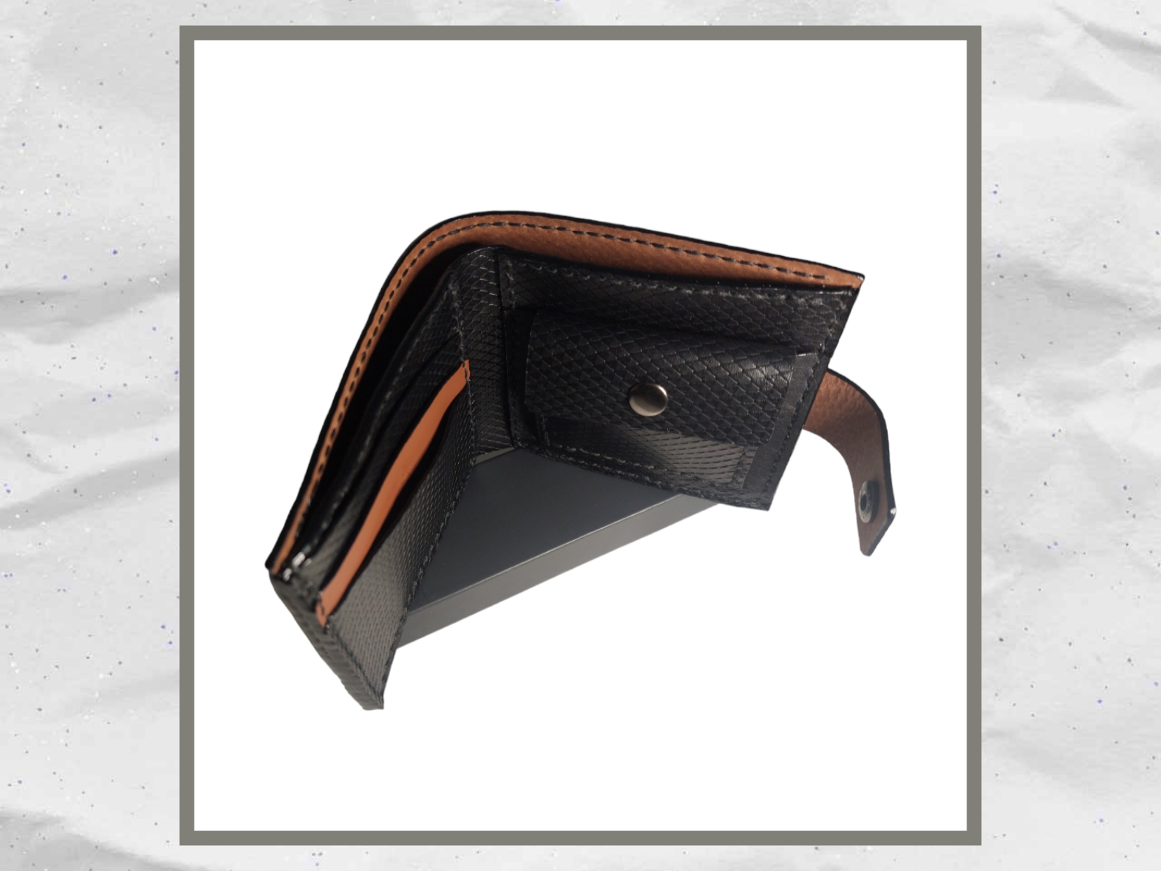 Χειροποίητο δερμάτινο πορτοφόλι με θήκη για χαρτονομίσματα, θήκη για νομίσματα, τρεις θήκες για κάρτες, συν δυο ακόμα εσωτερικές όπου και εκεί μπορούν να μπουν κάρτες (συνολο 5 θήκες). Κουμπώνει με λουράκι εξωτερικό και κουμπί για μεγαλύτερη ασφάλεια.